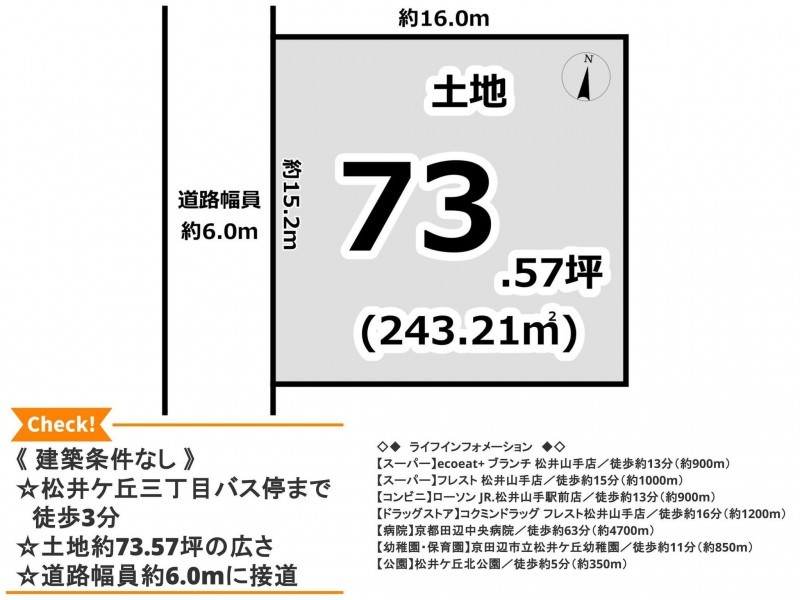 JR学研都市線(片町線) 松井山手駅 まで 徒歩12分 JR学研都市線(片町線) 大住駅 まで 徒歩24分 バス停松井ヶ丘3丁目 まで 徒歩3分 |