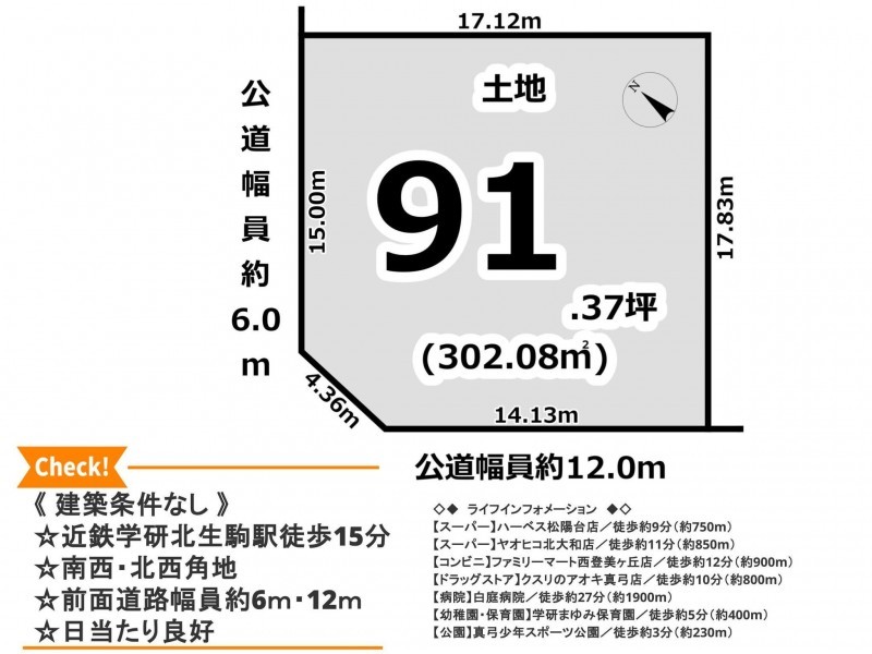 土地面積 公簿 302.08㎡(91.37坪)