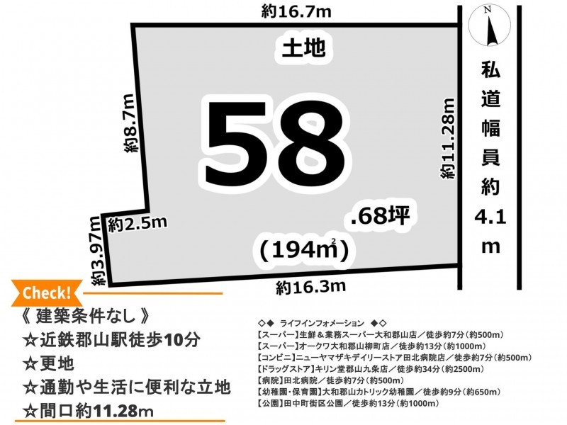 | 接道状況 | 東側 私道4.1m 間口約11.28m | ||