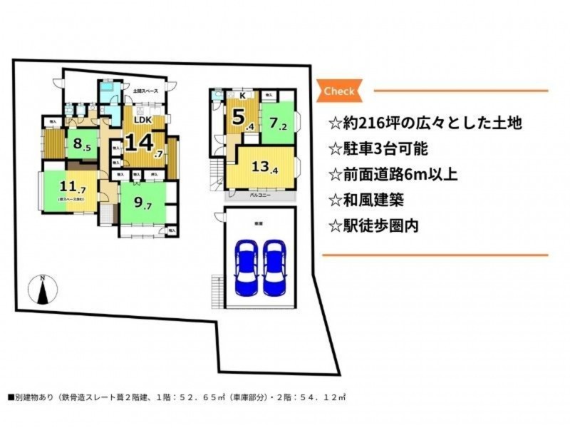 ■別建物あり(鉄骨造スレート葺2階建、1階:52.65㎡(車庫部分)・2階:54.12㎡ ■都市計画道路(木津鹿背山線)が敷地にかかっています。 ■車庫2台分+カースペース1台分あり(車種による) |
