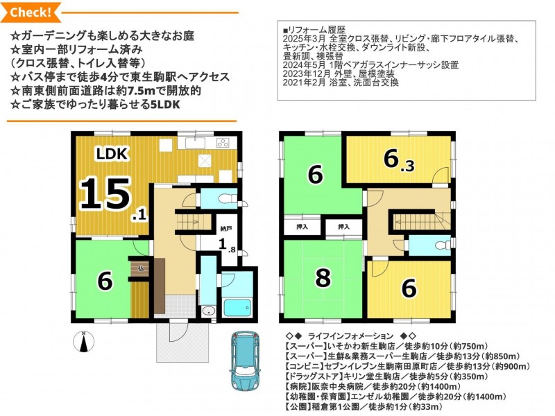■リフォーム履歴 2025年3月 全室クロス張替、リビング・廊下フロアタイル張替、キッチン・水栓交換、ダウンライト新設、畳新調、襖張替 2024年5月 1階ペアガラスインナーサッシ設置 2023年12月 外壁、屋根塗装 2021年2月 浴室、洗面台交換 ■施工:セキスイハイム |