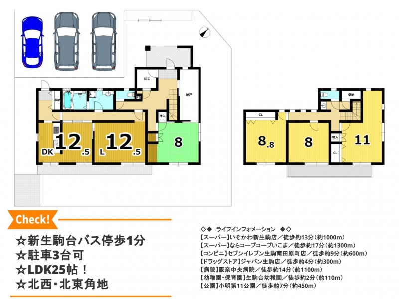 | 設備・条件 | システムキッチン、カウンターキッチン、食器洗浄乾燥機、シャンプードレッサー、浴室乾燥機、追い焚き、複層ガラス、ウォークインクローゼット、モニタ付インターホン、駐車場2台分、駐車場3台分、床下収納、トイレ2箇所、電気,上水道,下水道,浄水器 | ||