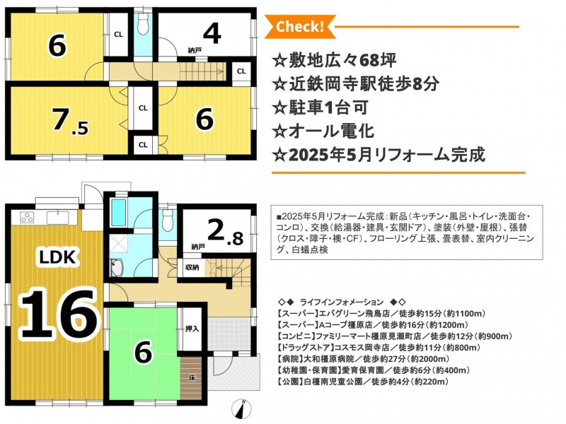 | 備考 | ■2025年5月リフォーム完成:新品(キッチン・風呂・トイレ・洗面台・コンロ)、交換(給湯器・建具・玄関ドア)、塗装(外壁・屋根)、張替(クロス・障子・襖・CF)、フローリング上張、畳表替、室内クリーニング、白蟻点検 | ||