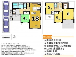 | 設備・条件 | 側溝、システムキッチン、カウンターキッチン、食器洗浄乾燥機、シャンプードレッサー、洗浄便座、浴室乾燥機、追い焚き、床暖房、ウォークインクローゼット、モニタ付インターホン、駐車場2台分、床下収納、トイレ2箇所、太陽光発電システム、電気、パントリー、SIC、ミストサウナ、タンクレストイレ | ||