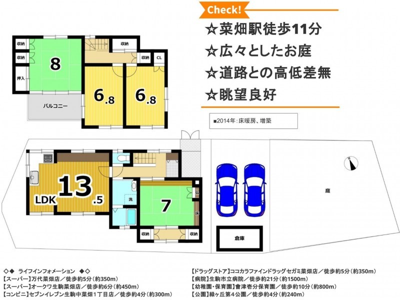 ■2014年リフォーム済:リビング電動シャッター、床暖房、一部増築、階段等、浴室暖房機付き ■一部未登記部分あり |