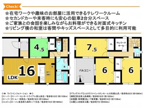 | 設備・条件 | ルーフバルコニー、システムキッチン、カウンターキッチン、シャンプードレッサー、浴室乾燥機、モニタ付インターホン、洗浄便座、複層ガラス、駐車場2台分、床下収納、トイレ2箇所、浄水器, 火災警報器等設置済,給湯,人感センサー玄関灯,防犯カメラ,電気 | ||
