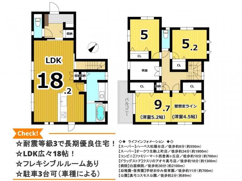 設備・条件 システムキッチン、カウンターキッチン、食器洗浄乾燥機、シャンプードレッサー、洗浄便座、浴室乾燥機、追い焚き、床暖房、複層ガラス、モニタ付インターホン、駐車場2台分、駐車場3台分、床下収納、トイレ2箇所、関西電力、浄水器、給湯、ガレージ、Wロック電池錠、室内物干
