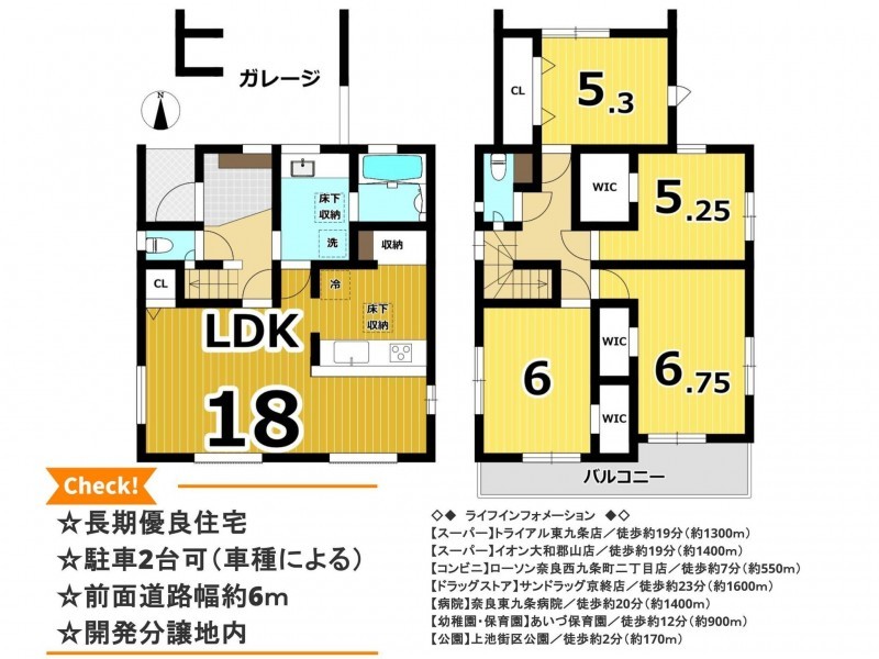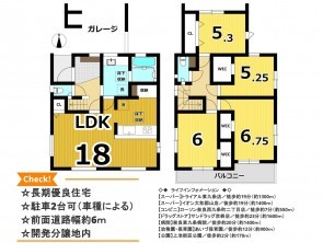 | 設備・条件 | システムキッチン、カウンターキッチン、食器洗浄乾燥機、シャンプードレッサー、洗浄便座、浴室乾燥機、複層ガラス、ウォークインクローゼット、モニタ付インターホン、駐車場2台分、床下収納、トイレ2箇所、関西電力、室内物干し、ガレージ | ||