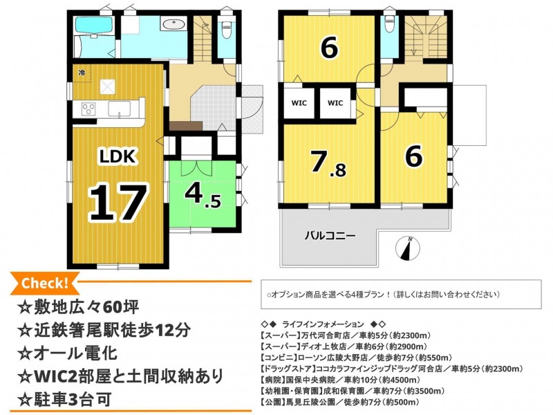 | 設備・条件 | オール電化、複層ガラス、ウォークインクローゼット、モニタ付インターホン、駐車場2台分、駐車場3台分、床下収納、トイレ2箇所、土間収納、網戸シャッター | ||