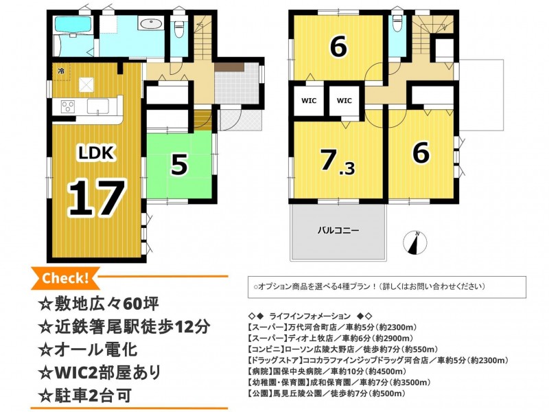 | 設備・条件 | オール電化、複層ガラス、ウォークインクローゼット、1BOX駐車可、駐車場2台分、床下収納、トイレ2箇所、シャッター雨戸 | ||