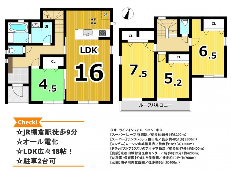 | 設備・条件 | システムキッチン、食器洗浄乾燥機、オール電化、IHクッキングヒーター、洗浄便座、複層ガラス、ルーフバルコニー、モニタ付インターホン、駐車場2台分、床下収納、トイレ2箇所、電気, 給湯, ディンプルキー, 火災警報器等設置済 | ||