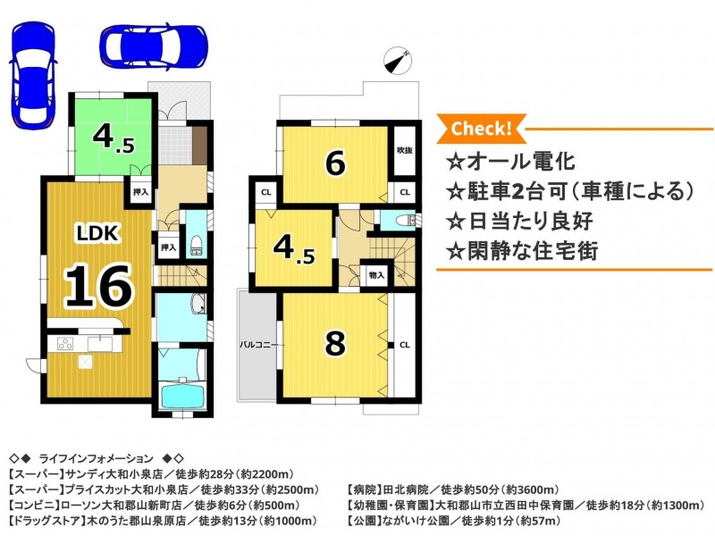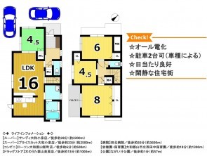 | 設備・条件 | オール電化、システムキッチン、カウンターキッチン、食器洗浄乾燥機、シャンプードレッサー、浴室乾燥機、モニタ付インターホン、洗浄便座、駐車場2台分、電気,上水道,下水道 | ||