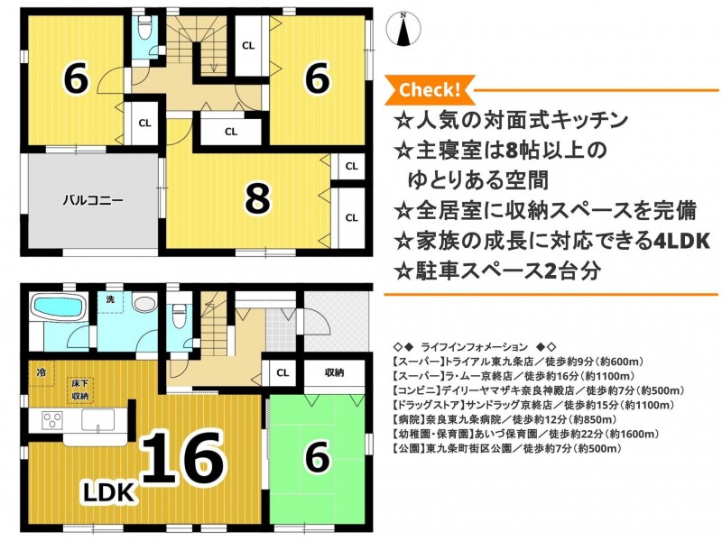 設備・条件 システムキッチン、カウンターキッチン、洗浄便座、浴室乾燥機、複層ガラス、ルーフバルコニー、モニタ付インターホン、駐車場2台分、床下収納、トイレ2箇所、浄水器, ディンプルキー, 火災警報器等設置済, セットバック