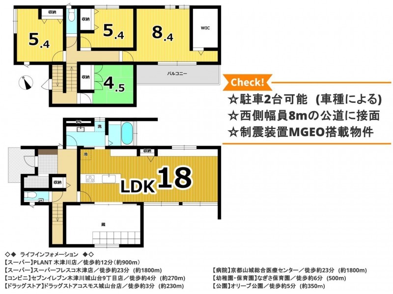 | 設備・条件 | オール電化、ルーフバルコニー、ウォークインクローゼット、駐車場2台分、トイレ2箇所、制震装置MGEO搭載 | ||