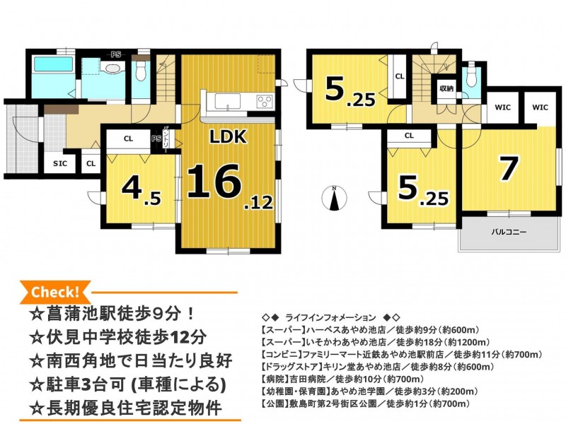 | 設備・条件 | 浴室乾燥機、モニタ付インターホン、ウォークインクローゼット、駐車場2台分、駐車場3台分、床下収納、トイレ2箇所、洗面化粧台、シャワートイレ、フラット35S、建物10年保証、シューズインクローク、関西電力 | ||