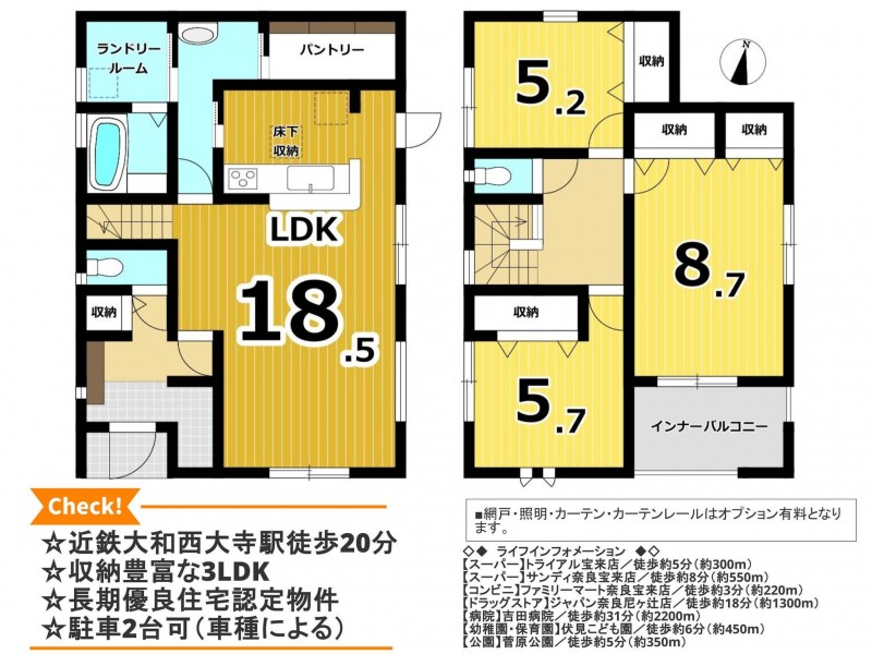 | 設備・条件 | システムキッチン、カウンターキッチン、シャンプードレッサー、浴室乾燥機、モニタ付インターホン、洗浄便座、追い焚き、駐車場2台分、床下収納、トイレ2箇所、浄水器、照明器具付き、ディンプルキー、ランドリールーム、パントリー | ||