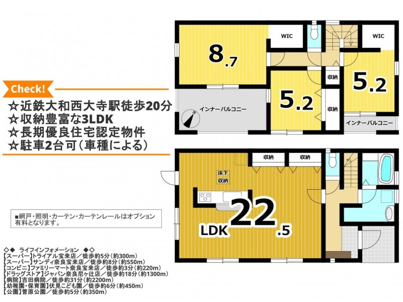 | 設備・条件 | システムキッチン、カウンターキッチン、シャンプードレッサー、浴室乾燥機、モニタ付インターホン、洗浄便座、ウォークインクローゼット、追い焚き、駐車場2台分、床下収納、トイレ2箇所、浄水器、照明器具付き、ディンプルキー | ||