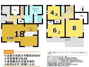 設備・条件 システムキッチン、カウンターキッチン、シャンプードレッサー、浴室乾燥機、モニタ付インターホン、洗浄便座、ウォークインクローゼット、追い焚き、駐車場2台分、床下収納、トイレ2箇所、浄水器、照明器具付き、ディンプルキー、ファミリークローゼット、ランドリールーム