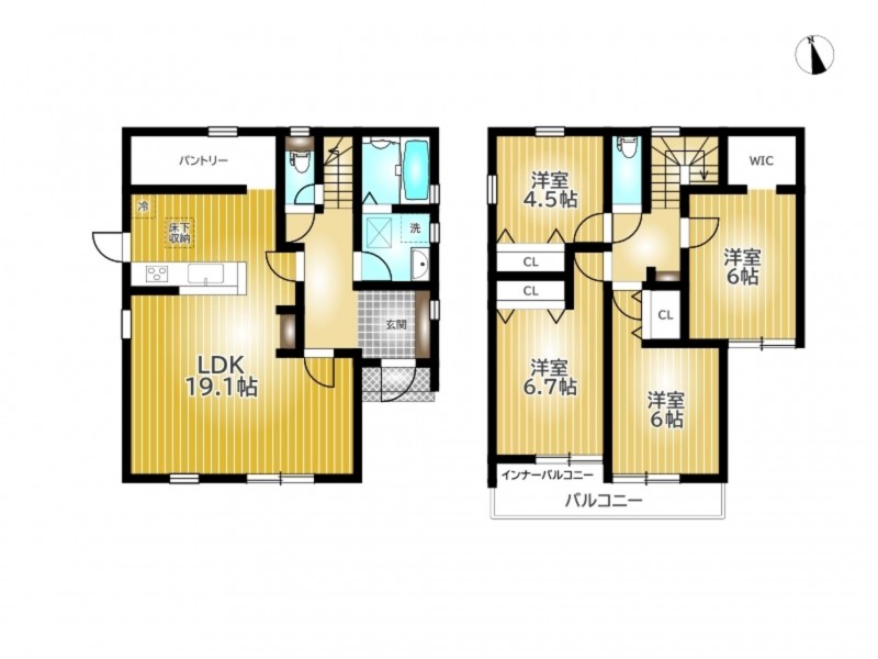 設備・条件 システムキッチン、カウンターキッチン、食器洗浄乾燥機、オール電化、IHクッキングヒーター、洗浄便座、浴室乾燥機、複層ガラス、ルーフバルコニー、ウォークインクローゼット、モニタ付インターホン、駐車場2台分、床下収納、トイレ2箇所、電気, 浄水器, 給湯, 収納スペース, 宅配ボックス, ディンプルキー, 火災警報器等設置済,パントリー