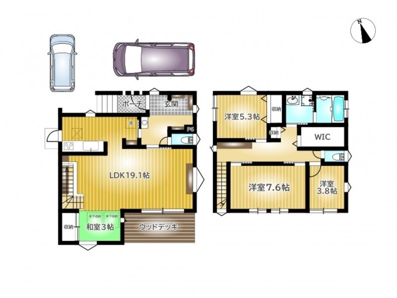 | 設備・条件 | システムキッチン、食器洗浄乾燥機、追い焚き、複層ガラス、ウォークインクローゼット、モニタ付インターホン、1BOX駐車可、駐車場2台分、トイレ2箇所、ウッドデッキ、カーポート | ||