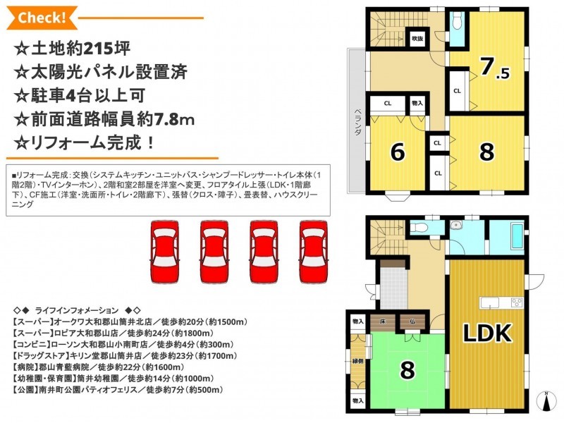 ■倉庫あり:軽量鉄骨造平家建51.24㎡ ■リフォーム完成:交換(システムキッチン・ユニットバス・シャンプードレッサー・トイレ本体(1階2階)・TVインターホン)、2階和室2部屋を洋室へ変更、フロアタイル上張(LDK・1階廊下)、CF施工(洋室・洗面所・トイレ・2階廊下)、張替(クロス・障子)、畳表替、ハウスクリーニング |