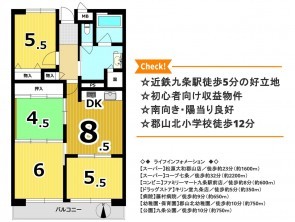 | 小学校区 | 郡山北 (900m) | 中学校区 | 郡山 (1900m) |