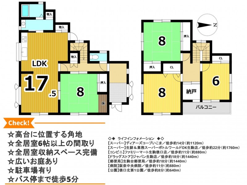 近鉄難波線・奈良線 生駒駅 まで 徒歩32分 近鉄生駒線 生駒駅 バス8分乗車 バス停喜里が丘1町目 まで 徒歩5分 近鉄けいはんな線 生駒駅 バス8分乗車 バス停喜里が丘1町目 まで 徒歩5分 |