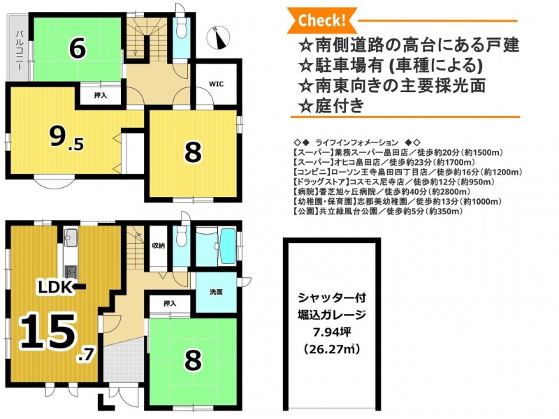 | 設備・条件 | 側溝、システムキッチン、シャンプードレッサー、洗浄便座、追い焚き、ウォークインクローゼット、トイレ2箇所、プロパンガス、電気、下水道、エアコン、照明器具、庭、シャッターガレージ(W=約3.25m、H=約2.06m、D=約6.6m)、三口以上コンロ、全居室収納 | ||