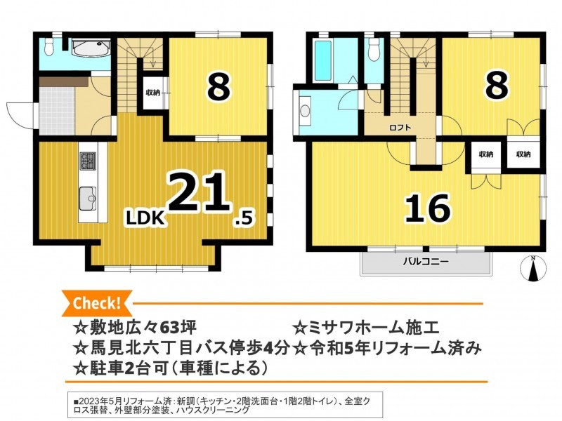 ■2023年5月リフォーム済:新調(キッチン・2階洗面台・1階2階トイレ)、全室クロス張替、外壁部分塗装、ハウスクリーニング ■バス所要時間調査日:2025/01/10 |