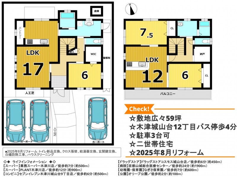 設備・条件 | システムキッチン、カウンターキッチン、食器洗浄乾燥機、IHクッキングヒーター、洗浄便座、追い焚き、ウォークインクローゼット、モニタ付インターホン、駐車場2台分、駐車場3台分、トイレ2箇所、電気、照明器具、カーポート | ||