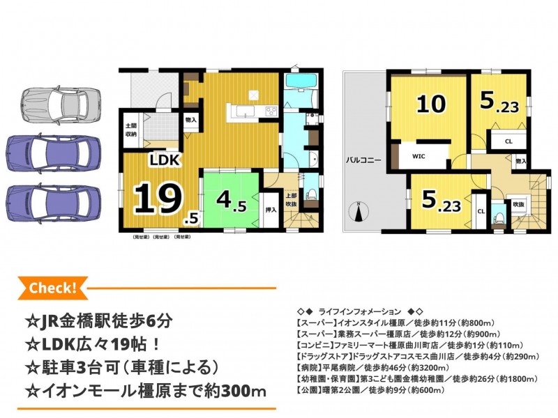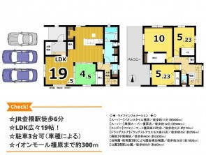 | 設備・条件 | 側溝、システムキッチン、食器洗浄乾燥機、洗浄便座、浴室乾燥機、追い焚き、複層ガラス、ウォークインクローゼット、モニタ付インターホン、駐車場2台分、駐車場3台分、床下収納、電気、浄水器、シャッター雨戸、吹抜け、SIC | ||