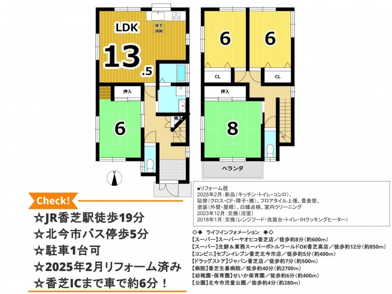 ■リフォーム歴 2025年2月:新品(キッチン・トイレ・コンロ)、貼替(クロス・CF・障子・襖)、フロアタイル上張、畳表替、塗装(外壁・屋根)、白蟻点検、室内クリーニング 2023年12月:交換(浴室) 2018年1月:交換(レンジフード・洗面台・トイレ・IHクッキングヒーター) ■駐車スペース:幅約3.1m×奥行約5.5m ■一部地域で香芝東中学校を選択可 |