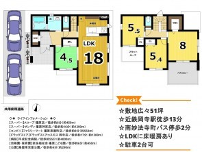 | 設備・条件 | 側溝、システムキッチン、カウンターキッチン、食器洗浄乾燥機、シャンプードレッサー、洗浄便座、浴室乾燥機、追い焚き、床暖房、ウォークインクローゼット、モニタ付インターホン、駐車場2台分、床下収納、トイレ2箇所、太陽光発電システム、電気、パントリー、SIC、ミストサウナ、タンクレストイレ | ||