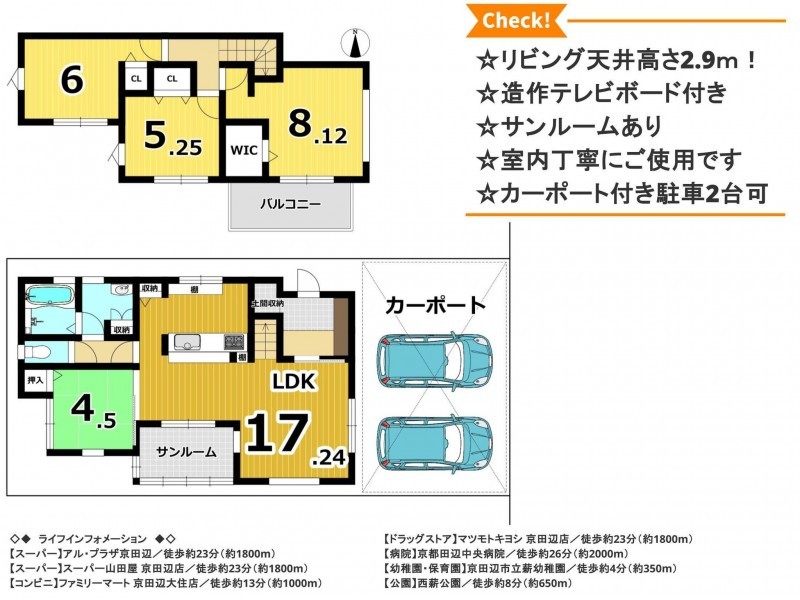 設備・条件 ウォークインクローゼット、駐車場2台分、電気、サンルーム、カーポート