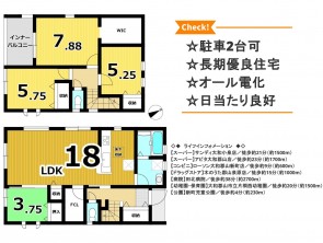| 設備・条件 | システムキッチン、カウンターキッチン、オール電化、シャンプードレッサー、洗浄便座、浴室乾燥機、追い焚き、ウォークインクローゼット、モニタ付インターホン、駐車場2台分、床下収納、トイレ2箇所、電気、浄水器、ディンプルキー、照明器具、ファミリークローゼット | ||