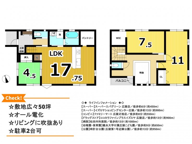 | 設備・条件 | システムキッチン、カウンターキッチン、オール電化、IHクッキングヒーター、ウォークインクローゼット、駐車場2台分、トイレ2箇所、太陽光発電システム、パントリー、カーポート、太陽光発電システム5.5kw、蓄電池 | ||
