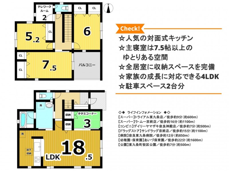 設備・条件 | システムキッチン、カウンターキッチン、洗浄便座、浴室乾燥機、複層ガラス、ルーフバルコニー、モニタ付インターホン、駐車場2台分、床下収納、トイレ2箇所、浄水器, ディンプルキー, 火災警報器等設置済, セットバック | ||