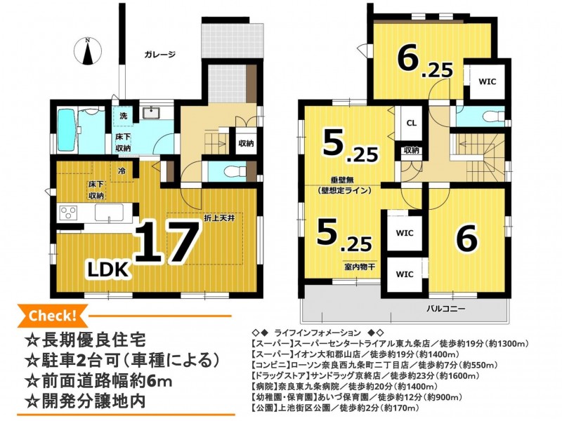 | 設備・条件 | カウンターキッチン、食器洗浄乾燥機、シャンプードレッサー、モニタ付インターホン、洗浄便座、ウォークインクローゼット、複層ガラス、追い焚き、駐車場2台分、床下収納、トイレ2箇所、電気, 浄水器, 給湯, 火災警報器等設置済, 2沿線以上利用可, BELS/省エネ基準適合認定, 制震構造、耐震構造、建設住宅性能評価 書(新築時)、長期優良住宅 | ||