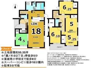 | 設備・条件 | カウンターキッチン、シャンプードレッサー、モニタ付インターホン、洗浄便座、ウォークインクローゼット、複層ガラス、追い焚き、駐車場2台分、駐車場3台分、床下収納、トイレ2箇所、電気,浄水器,給湯,火災警報器等設置済 | ||