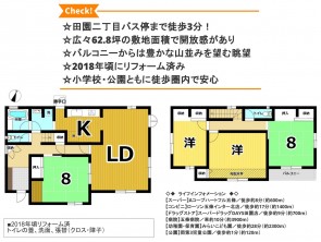 ■2018年頃リフォーム済:トイレの蓋、洗面、張替(クロス・障子) ■施工:大和ハウス工業(株) ■給湯器:配管のみ ■境界:前あり・裏不明 ■CB土圧かかっている ■前面アプローチが木の根っこで割れている |