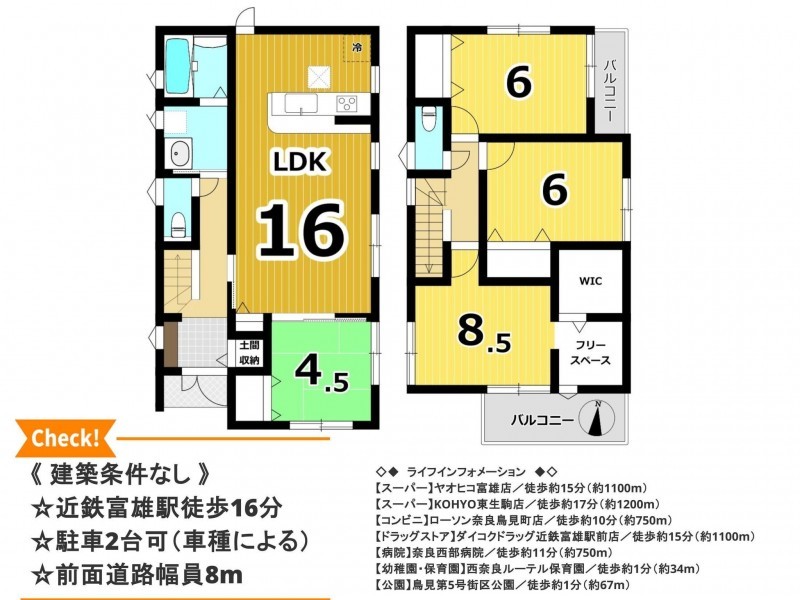 小学校区 鳥見 ( 550m ) 中学校区 富雄 ( 1300m )