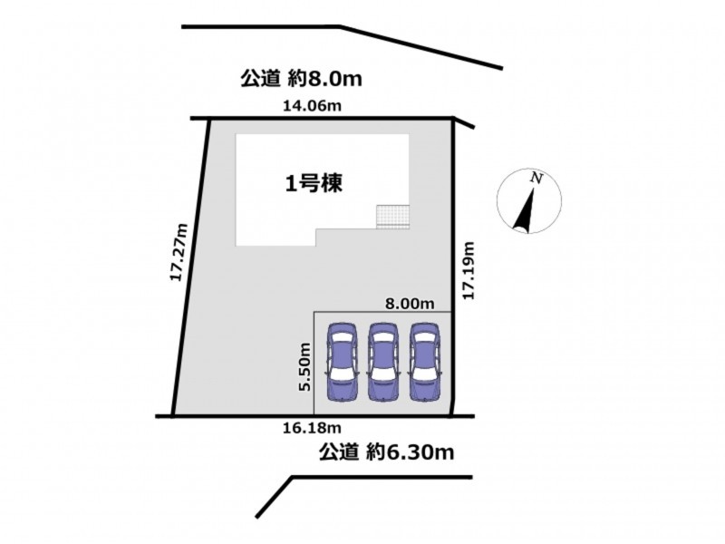 南側 公道6.3m 間口約16.18m 北側 公道8.0m 間口約14.06m |