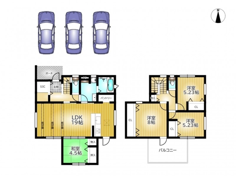 | 設備・条件 | システムキッチン、食器洗浄乾燥機、オール電化、IHクッキングヒーター、シャンプードレッサー、洗浄便座、浴室乾燥機、追い焚き、複層ガラス、モニタ付インターホン、駐車場2台分、駐車場3台分、床下収納、トイレ2箇所、電気、浄水器、パントリー、SIC、省エネ給湯器、シャッター雨戸 | ||
