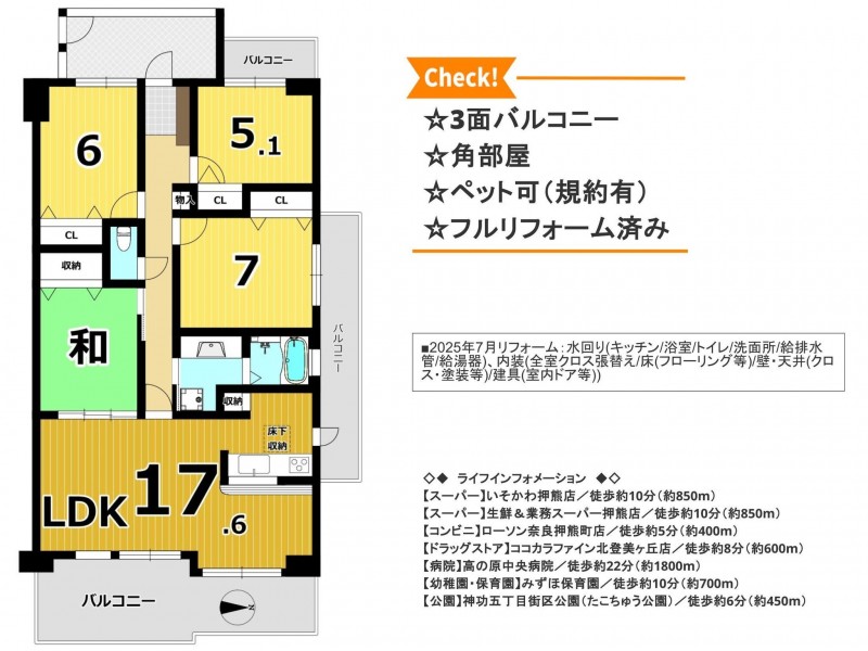 ■2025年7月リフォーム:水回り(キッチン/浴室/トイレ/洗面所/給排水管/給湯器)、内装(全室クロス張替え/床(フローリング等)/壁・天井(クロス・塗装等)/建具(室内ドア等))