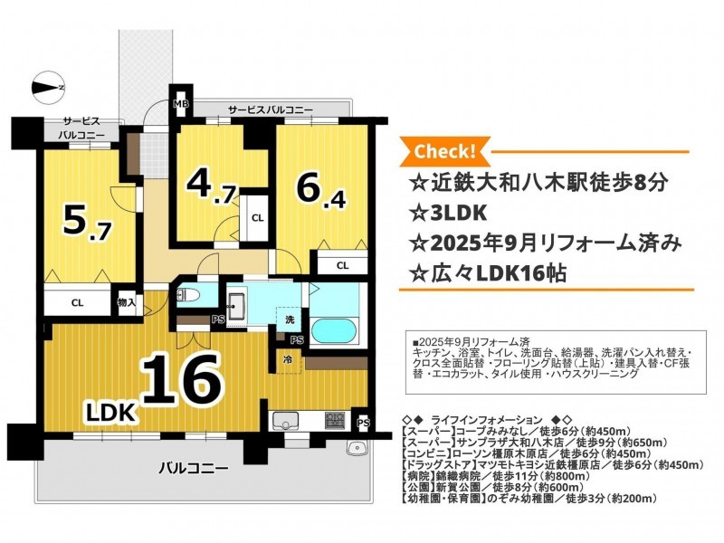 ■2025年9月リフォーム済み:キッチン、浴室、トイレ、洗面台、給湯器、洗濯パン入れ替え・クロス全面貼替 ・フローリング貼替(上貼) ・建具入替・CF張替 ・エコカラット、タイル使用 ・ハウスクリーニング